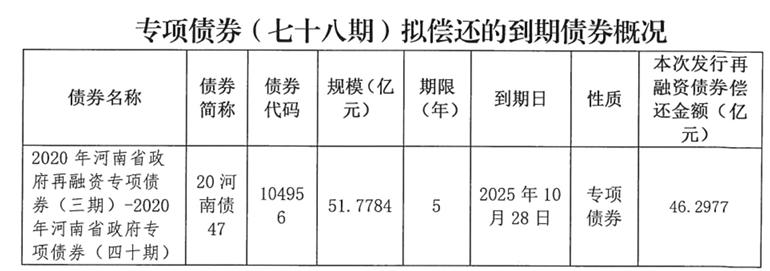 2025年河南省政府專項(xiàng)債券(七十八期)擬發(fā)行金額46.2977億元,用于償還2020年河南省政府再融資專項(xiàng)債券(三期)-2020年河南省政府專項(xiàng)債券(四十期)的部分本金。